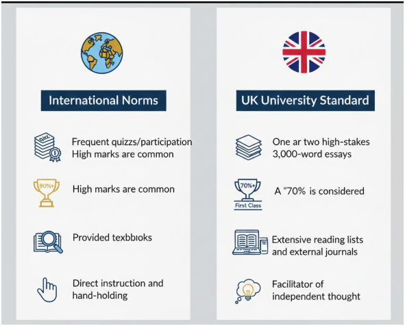 In many global education systems, students are guided closely by instructors with frequent testing. In the UK, the focus shifts to self-directed study. A typical undergraduate may only have 12–15 “contact hours” per week, but is expected to perform 25–30 hours of independent research.